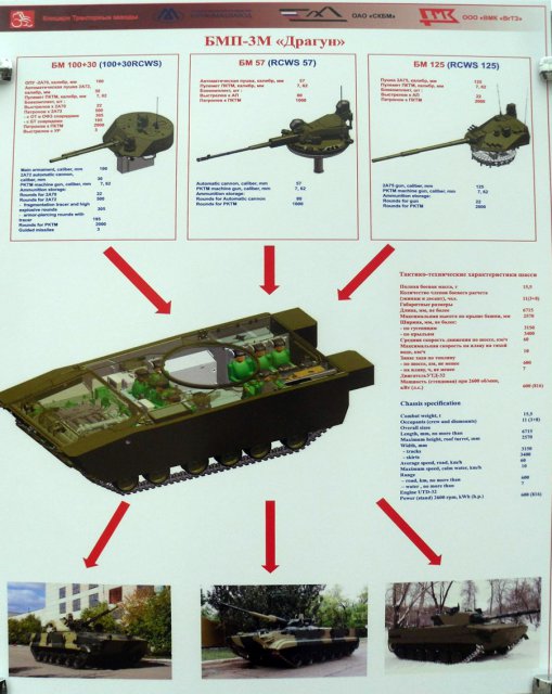 Questa nuova variante del veicolo da combattimento di fanteria BMP-3 è equipaggiato con il modulo di combattimento senza pilota Dragun e il powerpack situato nella parte anteriore presenta diversi vantaggi rispetto ai veicoli BMP-3 di serie.