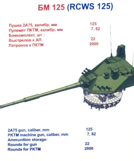 Torretta con equipaggio BM 125 (RCWS 125) con cannone da 125 mm a caricamento automatico. La variante da 125 mm è armata con un cannone ad anima liscia da 125 mm 2A75 caricato automaticamente in una torretta BM 125 con equipaggio, utilizzata sul cannone anticarro semovente 2S25 Sprut SDM-1, una versione migliorata del 2S25 Sprut-SD.
