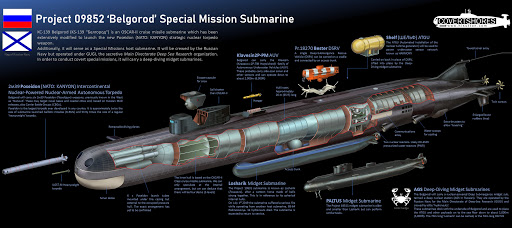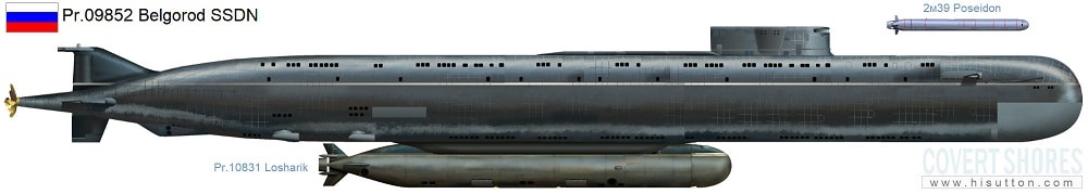 Il Belgorod è il primo vettore dell’unità subacquea strategica senza equipaggio denominata “Poseidon”. E’ stato progettato e realizzato per lanciare un attacco nucleare di rappresaglia al potenziale avversario nel caso in cui questi attaccasse per primo. Il Belgorod è stato varato il 23 aprile 2019. Servirà nell’Oceano Pacifico dopo aver superato le prove di stato e la messa in servizio.