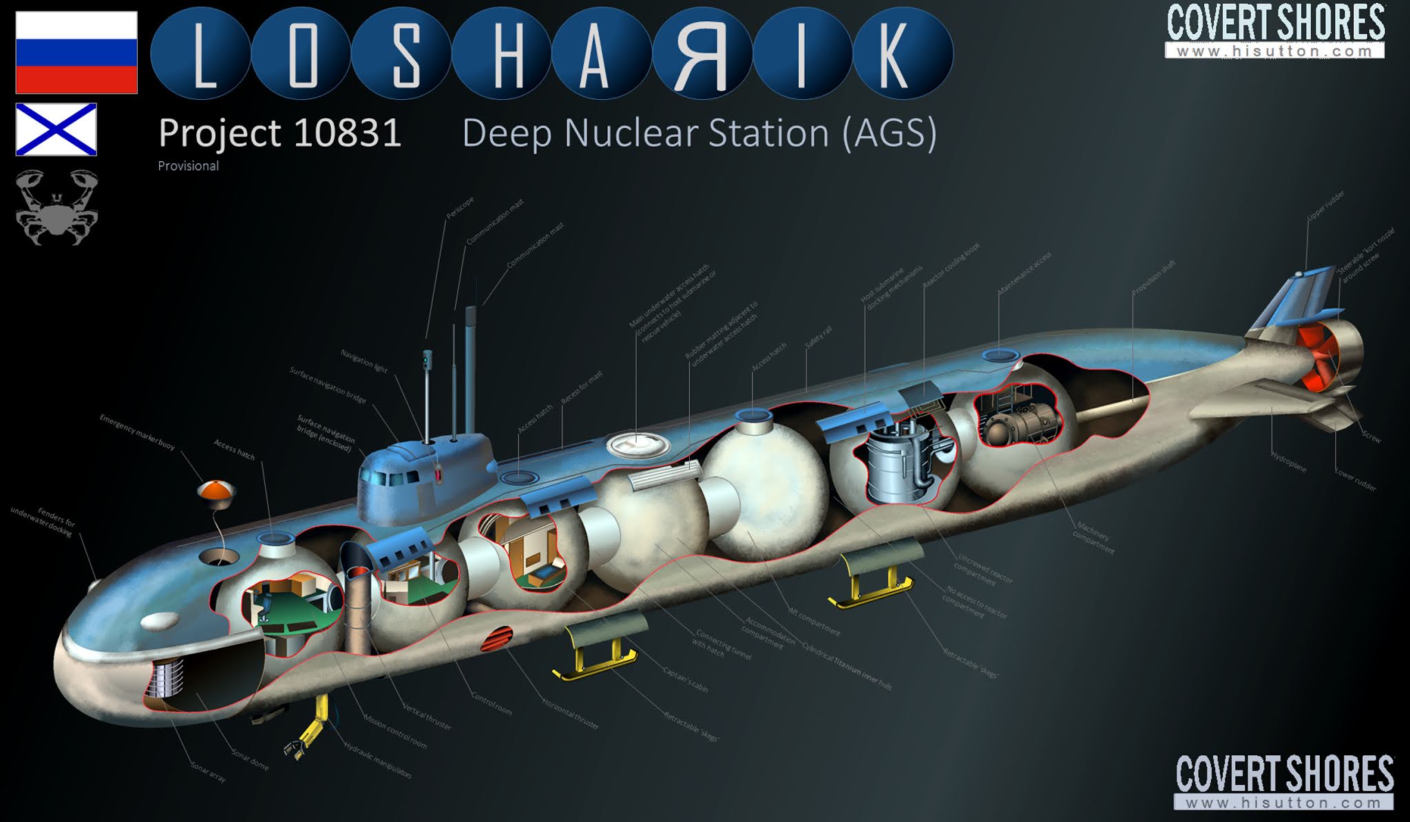 Le sue capacità sono state adattate a molti tipi di missioni con obiettivi strategici; questo sottomarino nucleare è quindi progettato per l’adattabilità, la capacità di utilizzare e consegnare diversi tipi di armi o altro materiale adatto ad operazioni classificate o di intelligence.