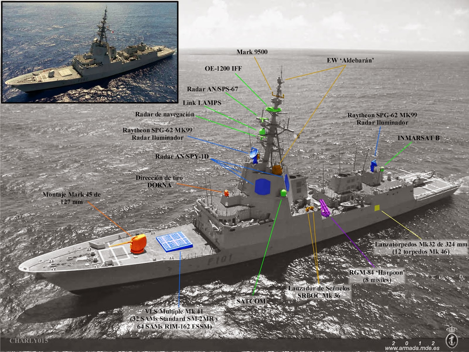 Il progetto della nave è stato costruito attorno al sistema AEGIS di difesa antiaerea missilistica, con un lanciatore verticale Mk.41 a 48 celle di progettazione statunitense, omologo di quelli in stallati sui cacciatorpediniere classe Arleigh Burke, e un radar di tipo SPY-1 a elementi fissi integrati nella sovrastruttura. Concettualmente le unità vengono ritenute dei cacciatorpediniere per potenza di fuoco e capacità di azione, e sono state impiegate per la scorta di portaerei statunitensi proprio al posto dei caccia della classe Burke, precisamente la capoclasse nel ruolo di schermo alla portaerei statunitense USS Theodore Roosevelt durante l’operazione Enduring Freedom, la Almirante Juan de Borbón (F-102) per la USS George H. W. Bush e la Blas de Lezo (F-103) con la portaerei francese Charles de Gaulle.