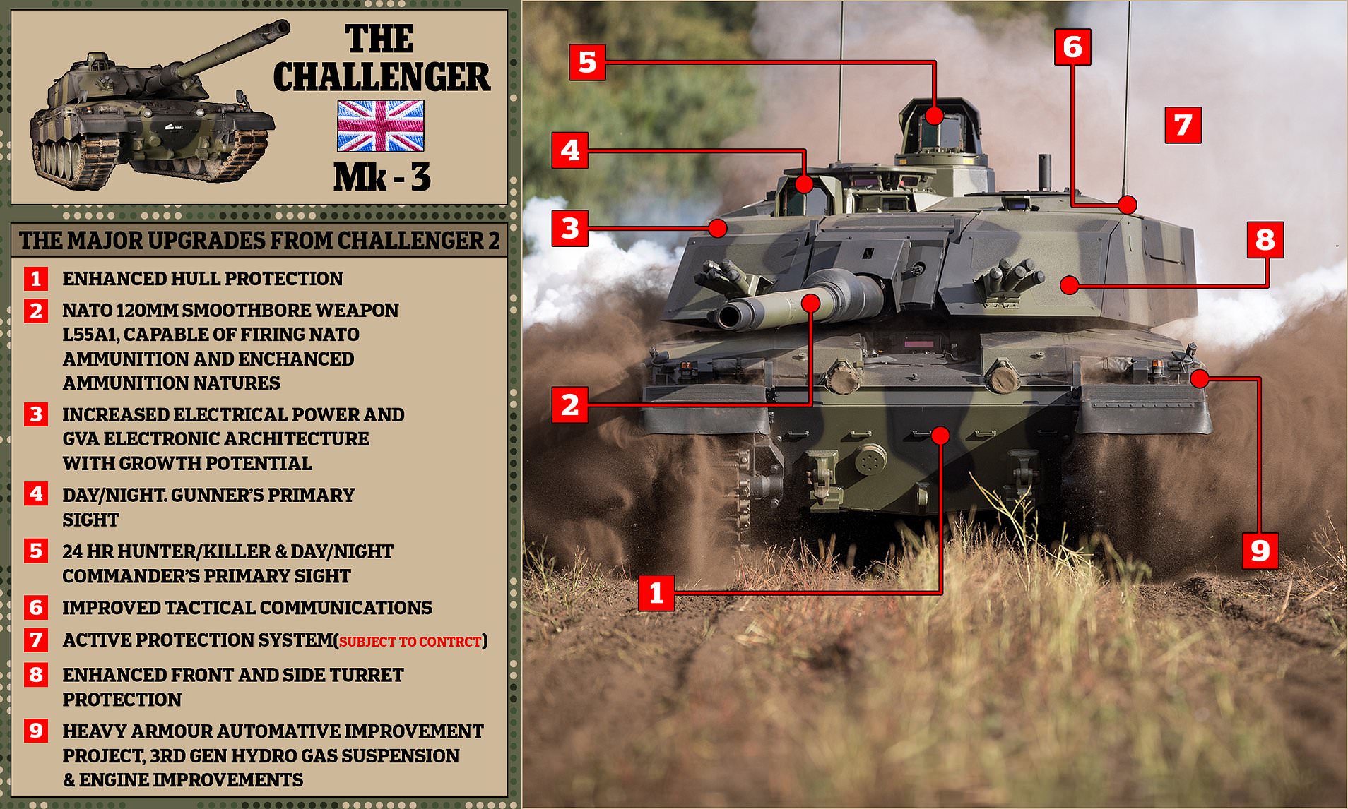 Ce ne saranno però di meno. L’esercito britannico dispone di 227 carri armati Challenger 2 obsoleti. Solo 148 di loro saranno modernizzati e non saranno del tutto nuovi. Il carro armato Challenger 3 utilizzerà il telaio esistente, ma avrà una nuova torretta digitale e un cannone a canna liscia da 120/55. Avrà anche un motore più potente.