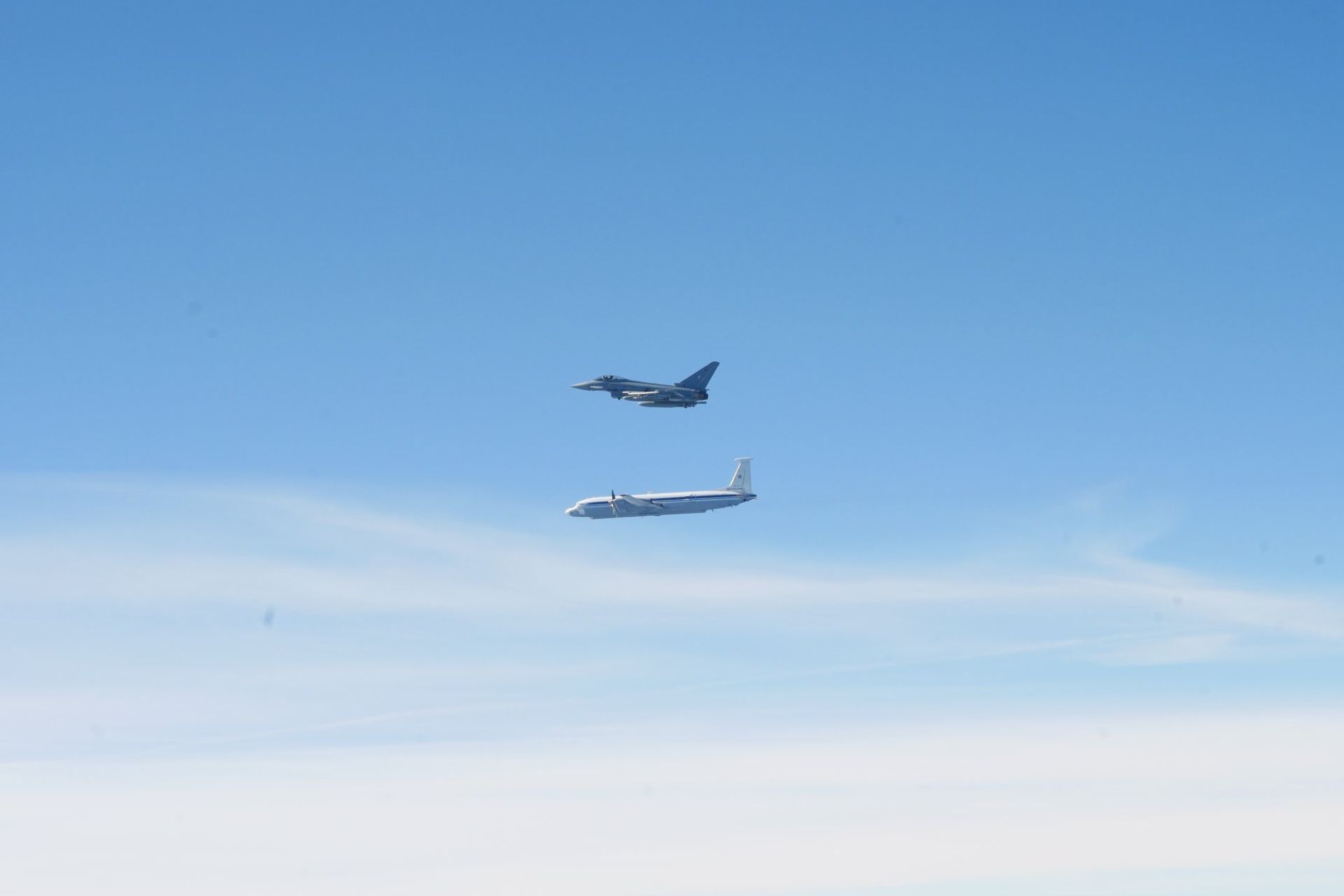Incercepted Russian IL-20 ELINT Plane and escorted by 2 Luftwaffe Eurofighter Typhoon. Wingman who take picture keep a missile lock distance (Picture source: Luftwaffe)