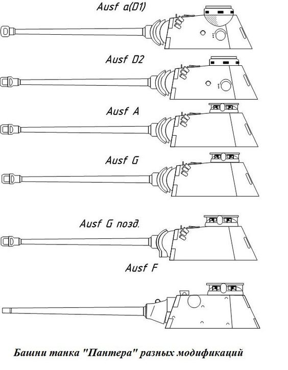 La prima versione ad essere prodotta fu l’Ausf. A, in realtà una pre-serie piuttosto che parte della produzione definitiva, alla quale subentrò l’Ausf. D (le versioni B e C non vennero mai messe in cantiere) e, curiosamente, un’altra Ausf. A, usata in maniera estesa in Normandia. L’ultima versione fu l’Ausf. G.[4] Le principali differenze tra le varie versioni riguardavano l’adozione di una protezione emisferica per la mitragliatrice di scafo, una diversa cupola del capocarro, uno scudo del cannone progettato in modo da impedire che colpi di rimbalzo colpissero il tetto dello scafo e un diverso armamento delle linee laterali dello scafo nella parte posteriore. Nelle ultime fasi della guerra alcuni Panther montarono anche un moderno sistema di visione notturna all’infrarosso. Alcuni degli ultimi Phanter Ausf.G erano dotati di piastre addizionali sul tetto della torretta e sulle griglie del vano motore per difendersi dai mitragliamenti aerei.