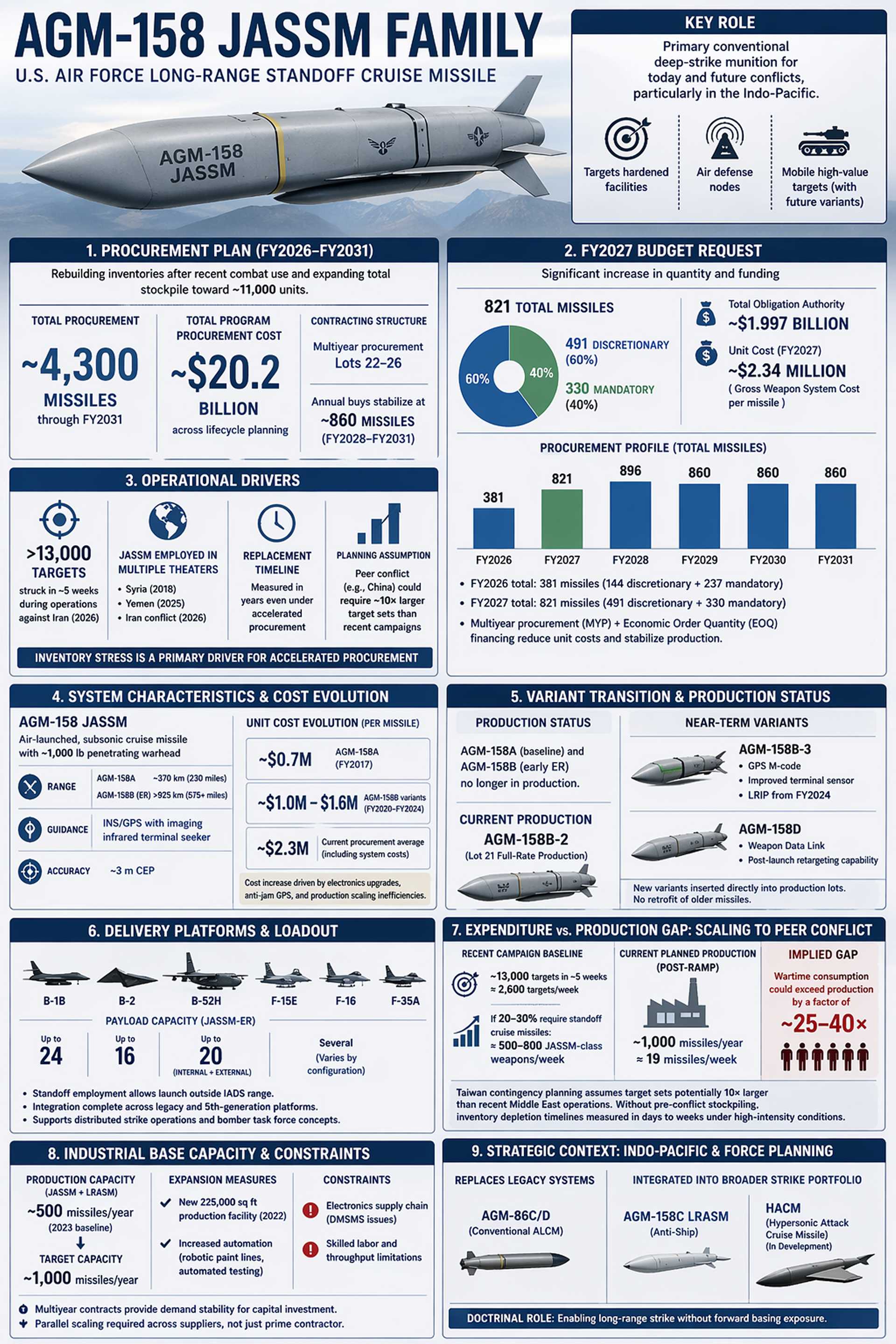 On April 23, 2026, the U.S. Air Force released a new procurement plan to acquire nearly 4,300 AGM-158 Joint Air-to-Surface Standoff Missiles (JASSMs) through fiscal year 2031, with the stated objective of rebuilding inventories after recent operations against Iran and expanding the total stockpile to about 11,000 units. The program is structured under a multiyear procurement framework covering Lots 22 to 26, with annual quantities rising sharply in the near term before stabilizing. Total program procurement is projected at about $20.2 billion over the planning horizon, including both baseline funding and advance procurement elements.
