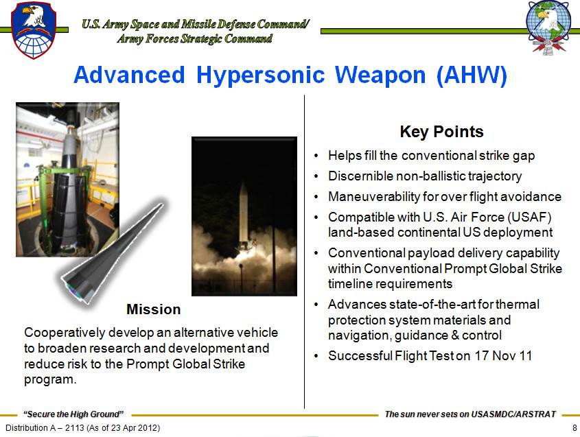 Il budget FY2010 per il programma AHW è stato di 46,9 milioni di dollari. La Defense Advanced Research Projects Agency (DARPA) ha completato i test di volo boost-glide nell’aprile 2010 e nell’agosto 2011. I risultati dei test sono stati utilizzati nel test di volo AHW.