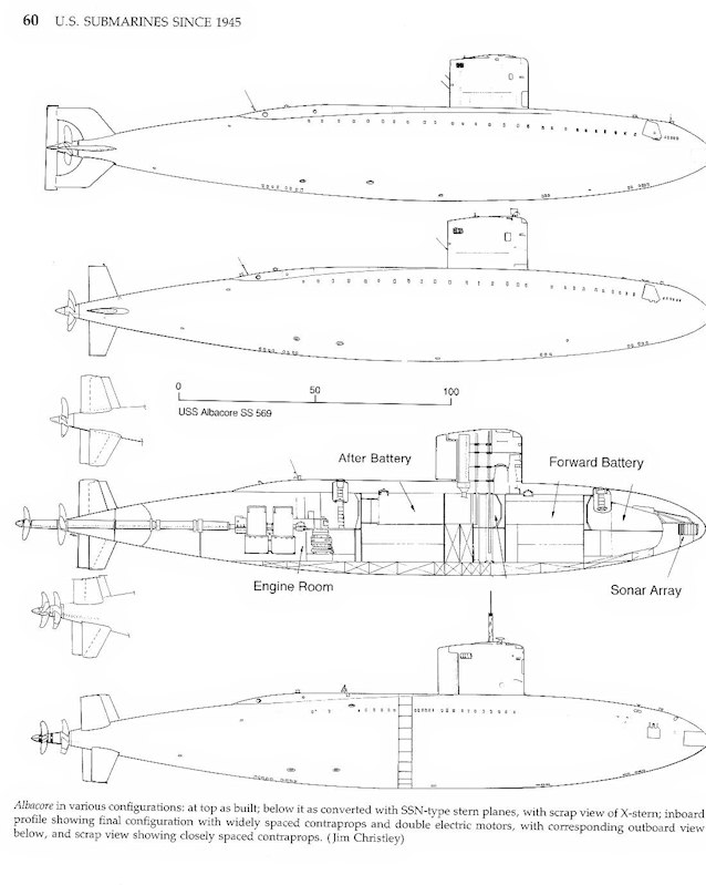 Dal dicembre 1955 al marzo 1956, l’Albacore subì un severo rinnovamento. Fino a quel momento, la sua elica era stata circondata dal timone e dalle superfici di controllo di poppa. Con il suo “nuovo look”, sembrava un dirigibile , con la sua elica a poppa di tutte le superfici di controllo.