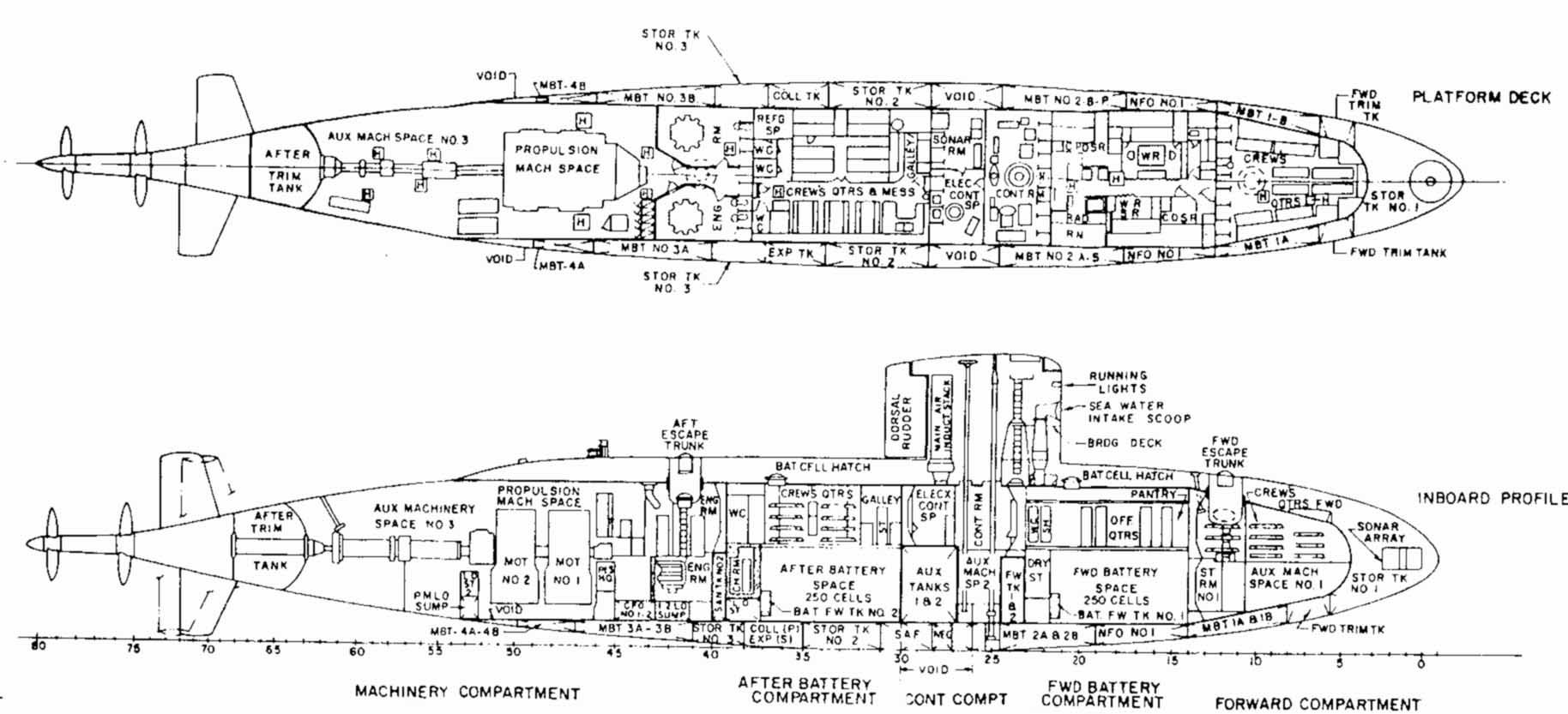 Scafo a pressione di poppa allargato e serbatoi di zavorra circostanti eliminati per ospitare due motori di propulsione principali, eliche controrotanti, batteria allo zinco argento;