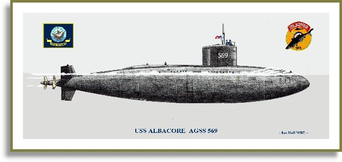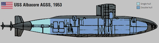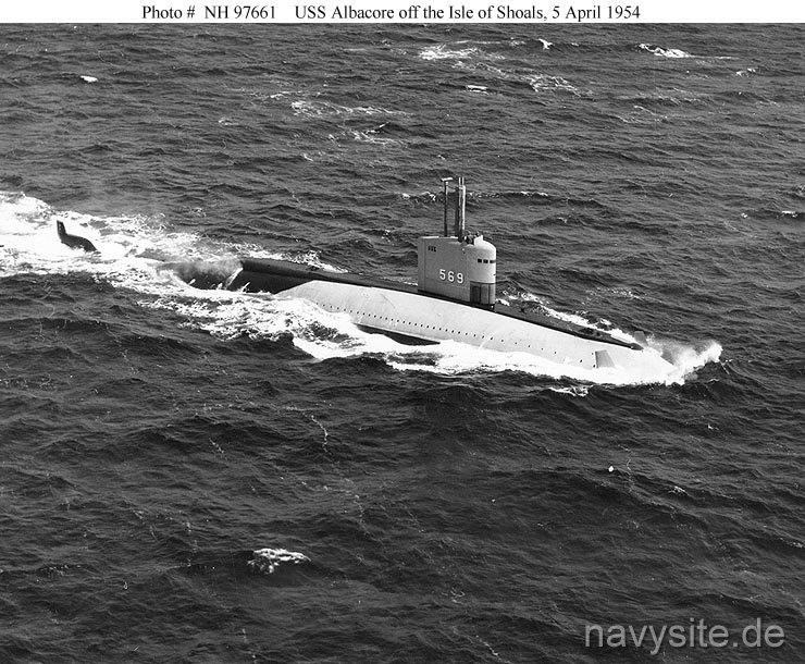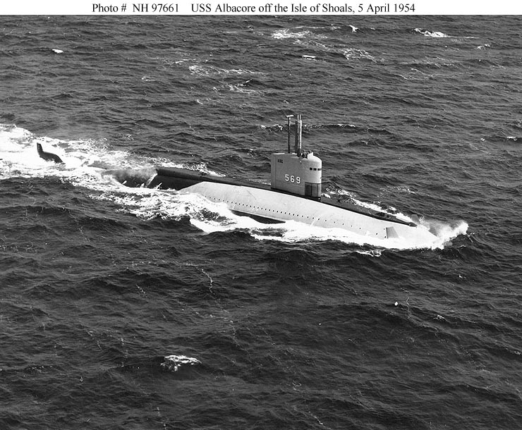 Verso la fine della seconda guerra mondiale, i comitati su entrambi i lati della cortina di ferro hanno studiarono gli usi del dopoguerra dell’energia atomica e consigliarono lo sviluppo della propulsione nucleare per le navi. Poiché le centrali nucleari funzionano in assenza di ossigeno, necessario ai macchinari convenzionali e poiché erano disponibili tecniche per convertire l’anidride carbonica in ossigeno, i progettisti di sottomarini rivolsero la loro attenzione a navi che potevano operare per lunghi periodi senza emergere. I sottomarini veterani fesero emergere un nuovo tipo di sottomarino in cui le caratteristiche delle prestazioni di superficie sarebbero state completamente subordinate all’elevata velocità e agilità in immersione. Nel 1949 un comitato speciale iniziò una serie di studi idrodinamici che portarono a un programma negli Stati Uniti Bureau of Ships per determinare quale forma di scafo sarebbe la migliore per le operazioni in immersione. Il bacino del modello David Taylor nel Maryland ha testato una serie di progetti. I due migliori – uno con una sola elica e l’altro con doppia elica – vennero poi testati in una galleria idrodinamica presso la Langley Air Force Base in Virginia. Per evitare l’interferenza della US NAVY, l’ ammiraglio Momsen ordinò al Bureau of Ships di progettare un sottomarino disarmato estremamente veloce e disse alla Marina che il sottomarino sarebbe stato un obiettivo pratico per i sottomarini di scorta alle portaerei. La versione con un unico albero fu adottata e la costruzione di un sottomarino sperimentale per questo progetto venne autorizzata il 25 novembre 1950. Lo scafo dell’Albacore utilizzava acciaio ad alta resistenza HY-80 con una resistenza allo snervamento di 80.000 psi (550 MPa), sebbene inizialmente non fosse utilizzato per aumentare la profondità di immersione rispetto ad altri sottomarini statunitensi. L’HY-80 è rimasto l’acciaio sottomarino standard per la classe LOS ANGELES. Altri componenti erano realizzati in acciaio ad alta resistenza (HTS). Questa unità fu classificata come sottomarino ausiliario (AGSS-569) e chiamata Albacore.