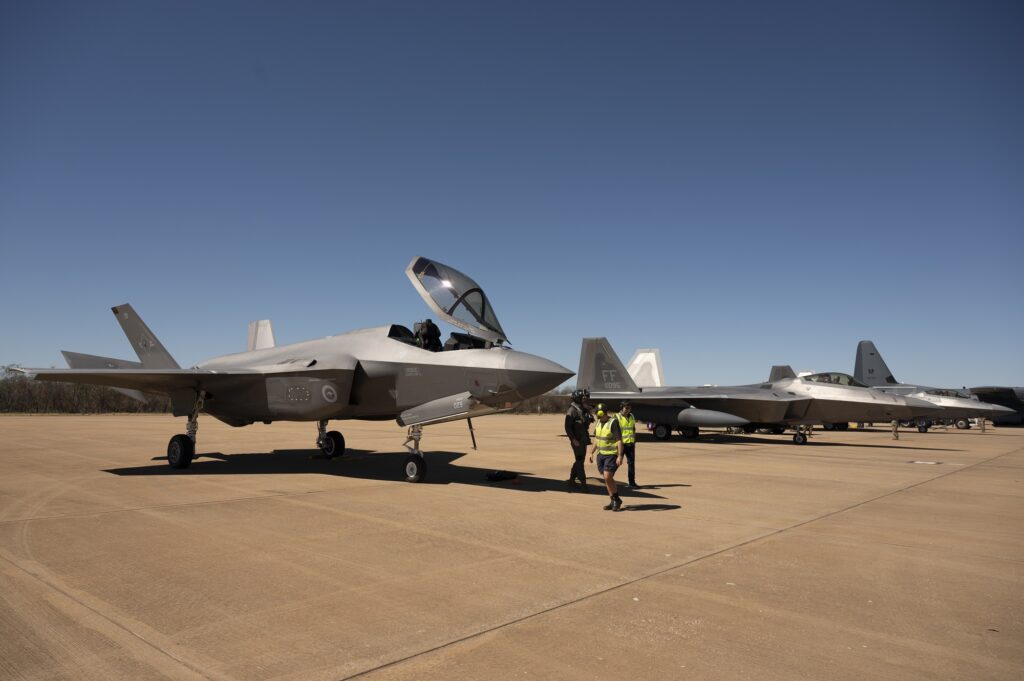 USAF F-22A and RAAF F-35A conduct joint hot pit refueling in remote Australia